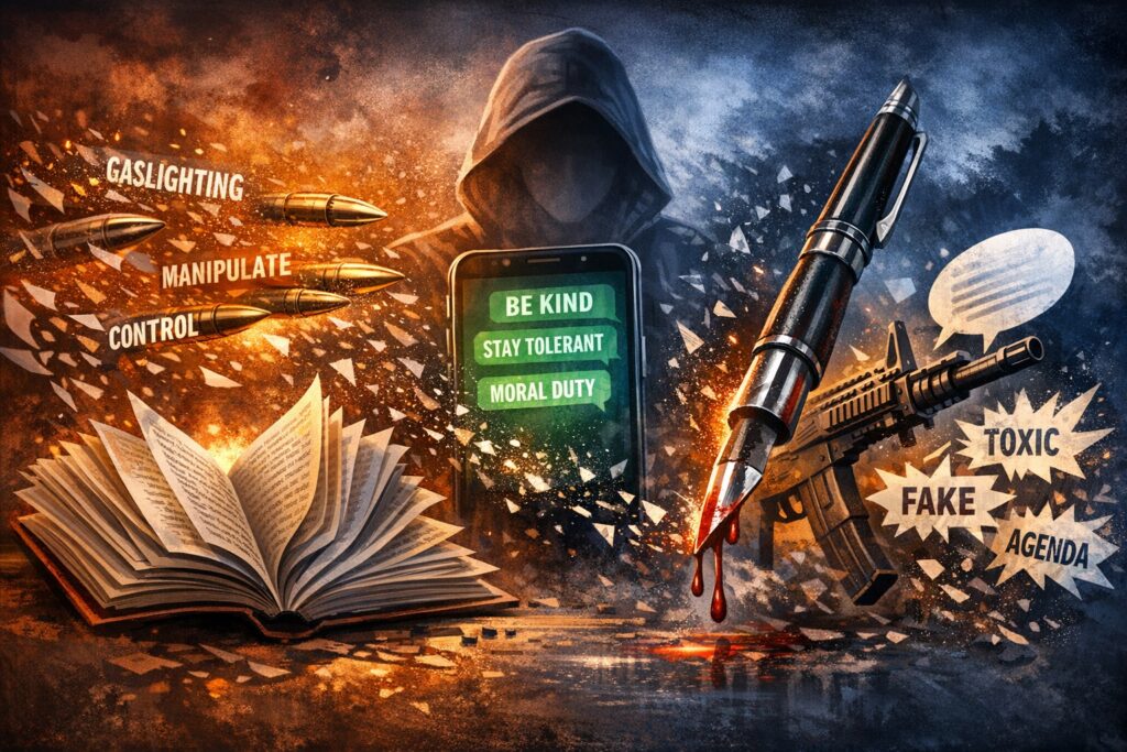 Every single word was weaponized – When this person said “Tolerant”, it didn’t mean that they were tolerant; it meant that they wanted the other person to shut up. “Kindness” didn’t mean genuine compassion—it meant stop making me uncomfortable. “Safe space” didn’t mean protecting vulnerability—it meant protecting stupidity from accountability.
