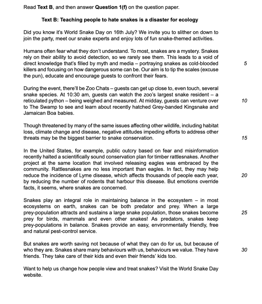 The text is titled “Teaching people to hate snakes is a disaster for ecology”, and the question is asking you “why do people have negative attitudes to snakes and why are these attitudes unfair and unjustified?”. You should be answering the question, not looking at every sentence and trying to find a ‘shorter’ way of writing it.