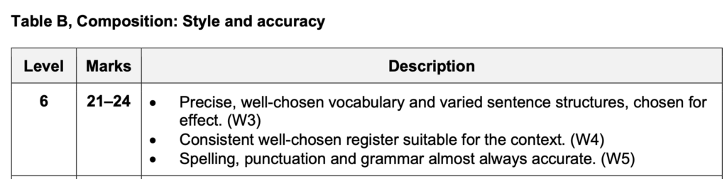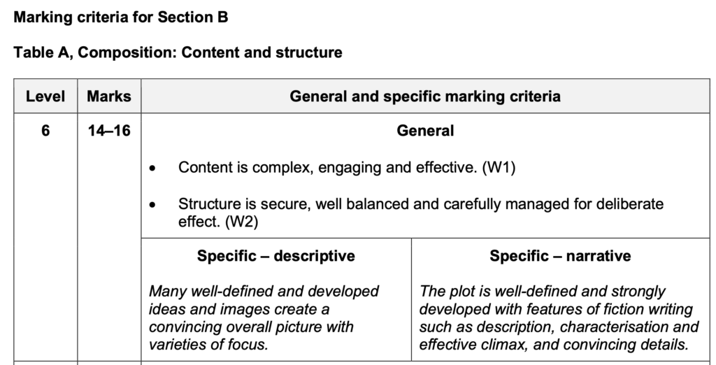Consider a few of these examples, demonstrating Level 6 from both descriptive and narrative writing in paper 2.
